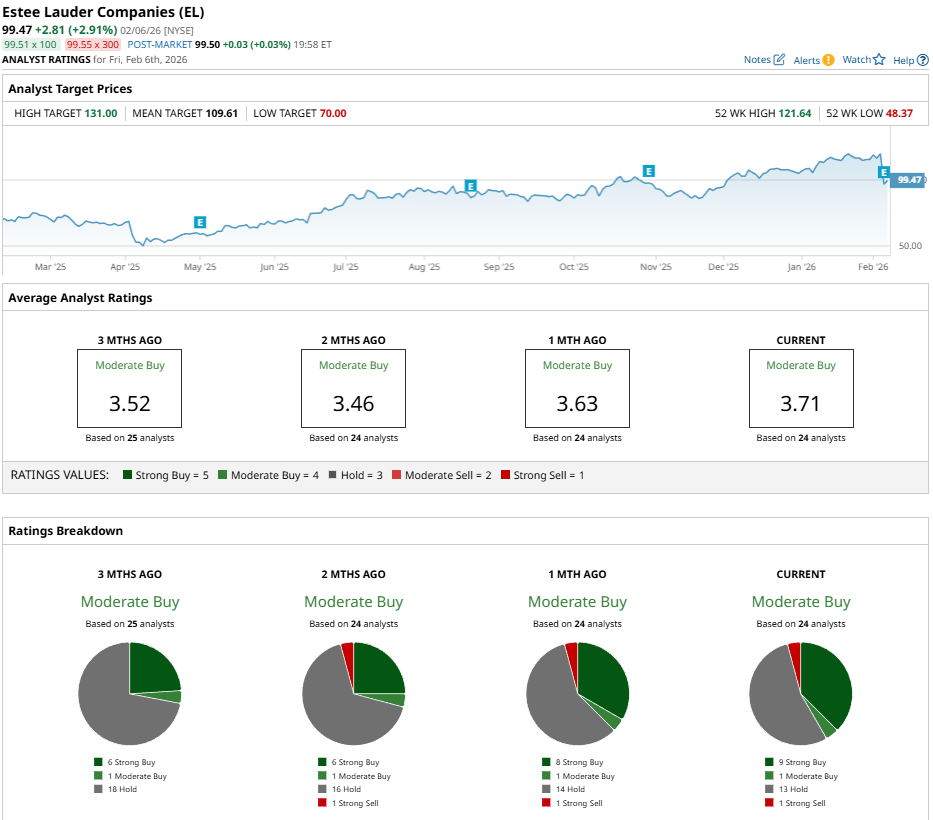 EL stock has been valued by 24 analysts with coverage. Currently, the stock has nine “Strong Buy” ratings, one “Moderate Buy” rating, 13 “Hold” ratings, and one “Strong Sell” rating.