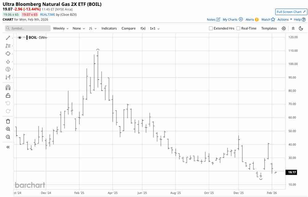 As the chart shows, the bullish BOIL ETF fell 67.6% from $46.85 to $15.20 per share from early December through early January before rising 171.4% to $41.25 per share in late January.