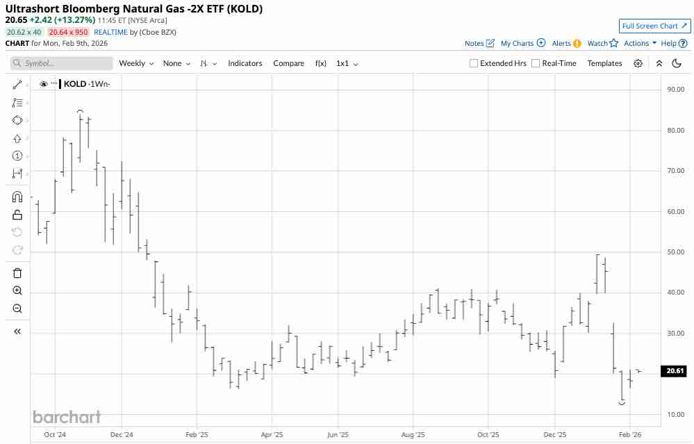 As the chart shows, the bearish KOLD ETF rose 160.4% from $19.00 to $49.47 per share from early December through early January, then fell 72.8% to $13.44 per share in late January.