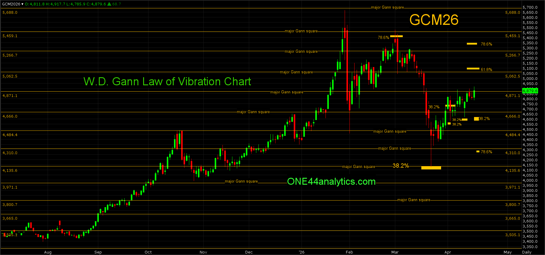 Below it, the short term target is 38.2% back to the 3/23/26 low at 4619.00, holding this level keeps the short term trend extremely positive and a new high can follow (ONE44 38.2% rule). The longer term target area is the 4310.00 major Gann square and 78.6% of the same move at 4290.00.