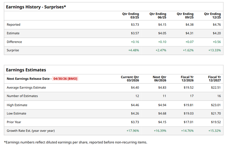 Mastercard Incorporated (MA), headquartered in Purchase, New York, provides transaction processing and other payment-related products and services. Valued at $464.9 billion by market cap, the company offers payment processing services for credit and debit cards, electronic cash, automated teller machines, and travelers checks. The payments giant is expected to announce its fiscal first-quarter earnings for 2026 before the market opens on Thursday, Apr. 30.