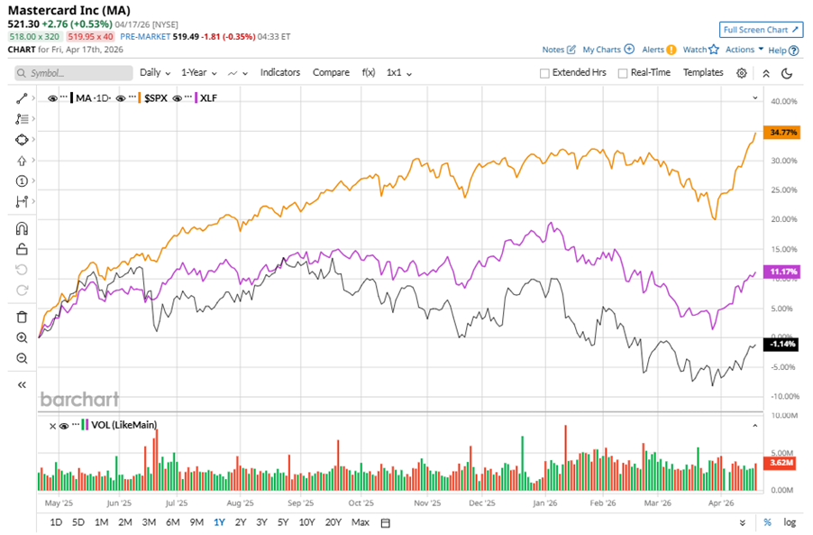 MA stock has underperformed the S&P 500 Index’s ($SPX) 34.9% gains over the past 52 weeks, with shares up marginally during this period. Similarly, it underperformed the State Street Financial Select Sector SPDR ETF’s (XLF) 12.4% gains over the same time frame.