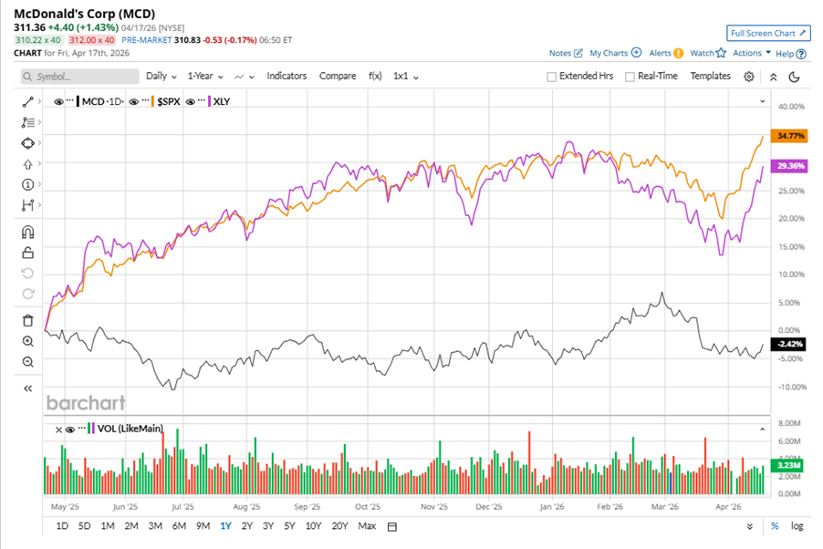 MCD stock has underperformed the S&P 500 Index’s ($SPX) 34.9% gains over the past 52 weeks, with shares up slightly during this period. Similarly, it underperformed the State Street Consumer Discretionary Select Sector SPDR ETF’s (XLY) 29.9% gains over the same time frame.