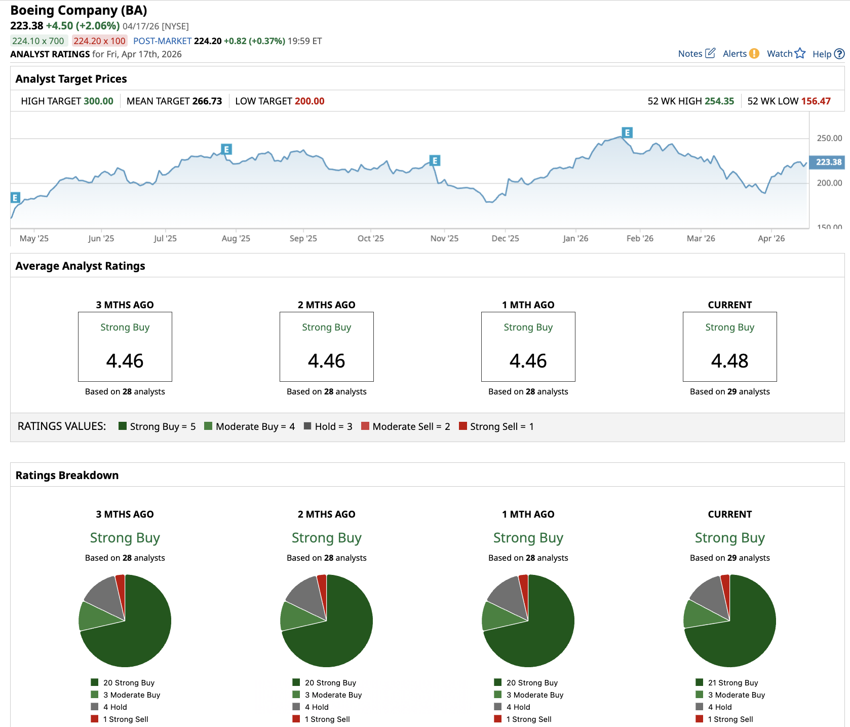 Out of the 29 analysts covering BA stock, 21 recommend “Strong Buy,” three recommend “Moderate Buy,” four recommend “Hold,” and one recommends “Strong Sell.” The average BA stock price target is $266.73, above the current price of about $223.