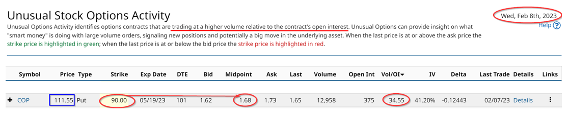 Investors in this unusual trade was over 34x the outstanding amount of put contracts at the time. This show they are very keen to short these long-dated out-of-the-money COP puts. For example, the volume was 12,958 puts traded at this strike price. At the time there were only 375 put contracts outstanding at $90 for May 19, 2023, expiration.