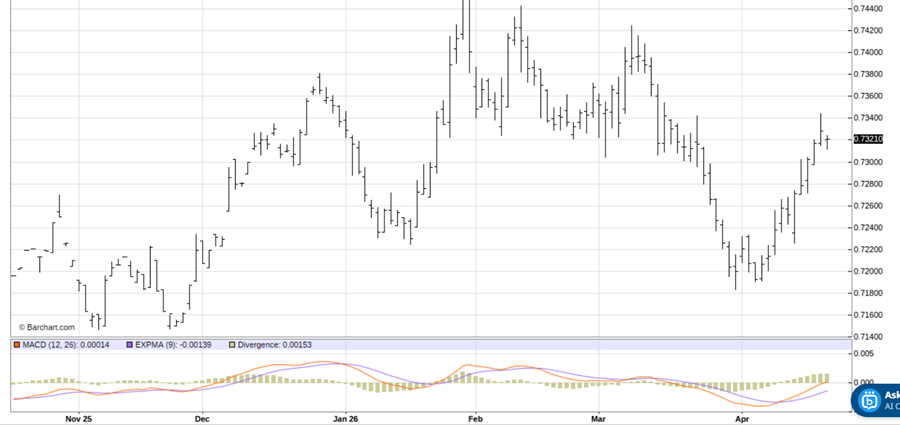 See on the daily bar chart for the June Canadian dollar futures that prices are trending up and last week hit a four-week high. See, too that the moving average convergence divergence (MACD) indicator is also in a bullish mode as the blue MACD line is above the red trigger line and both lines are trending up. The bulls have the near-term technical advantage.