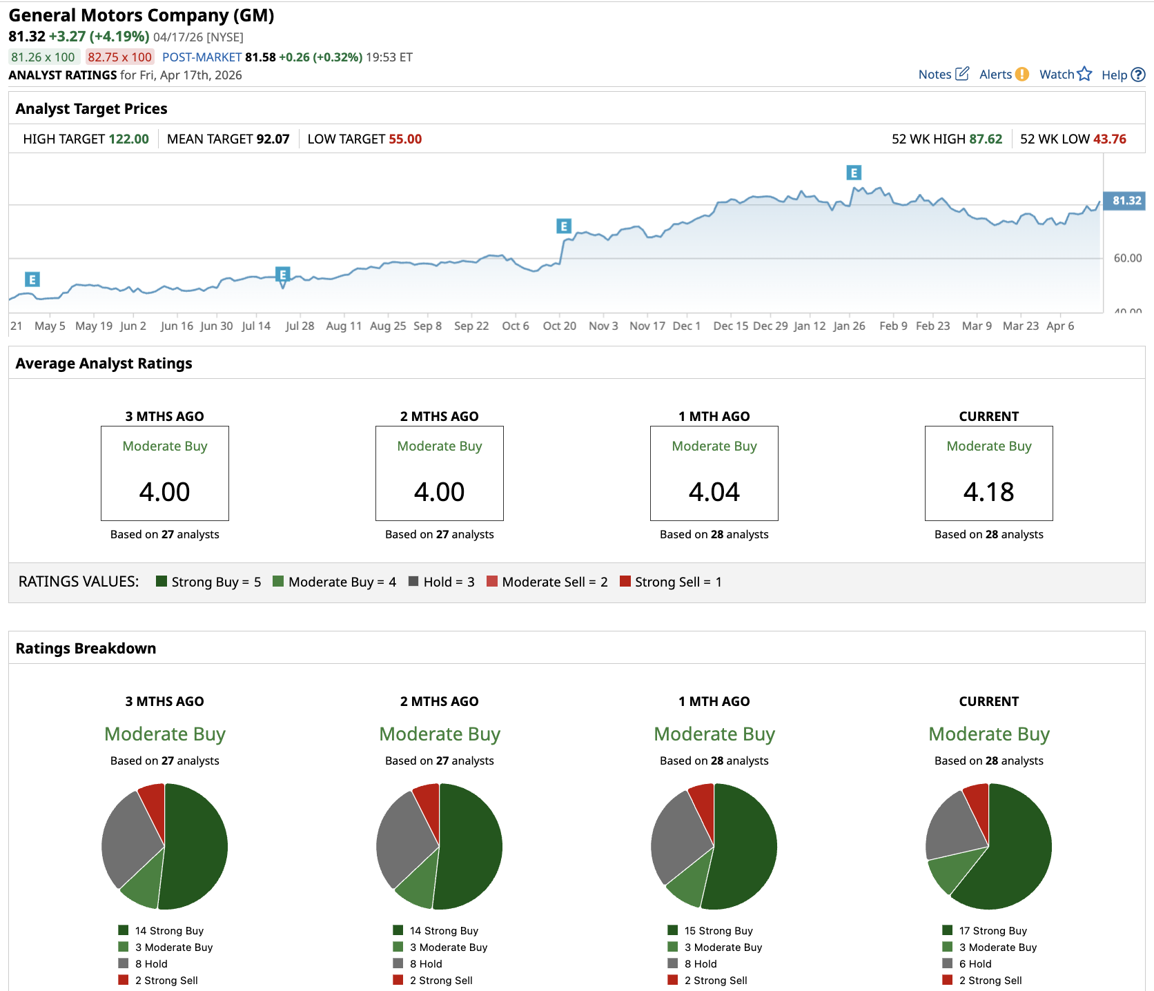 Out of the 28 analysts covering GM stock, 17 recommend “Strong Buy,” three recommend “Moderate Buy,” six recommend “Hold,” and two recommend “Strong Sell.” The average GM stock price target is $92.07, above the current price of $81.32.