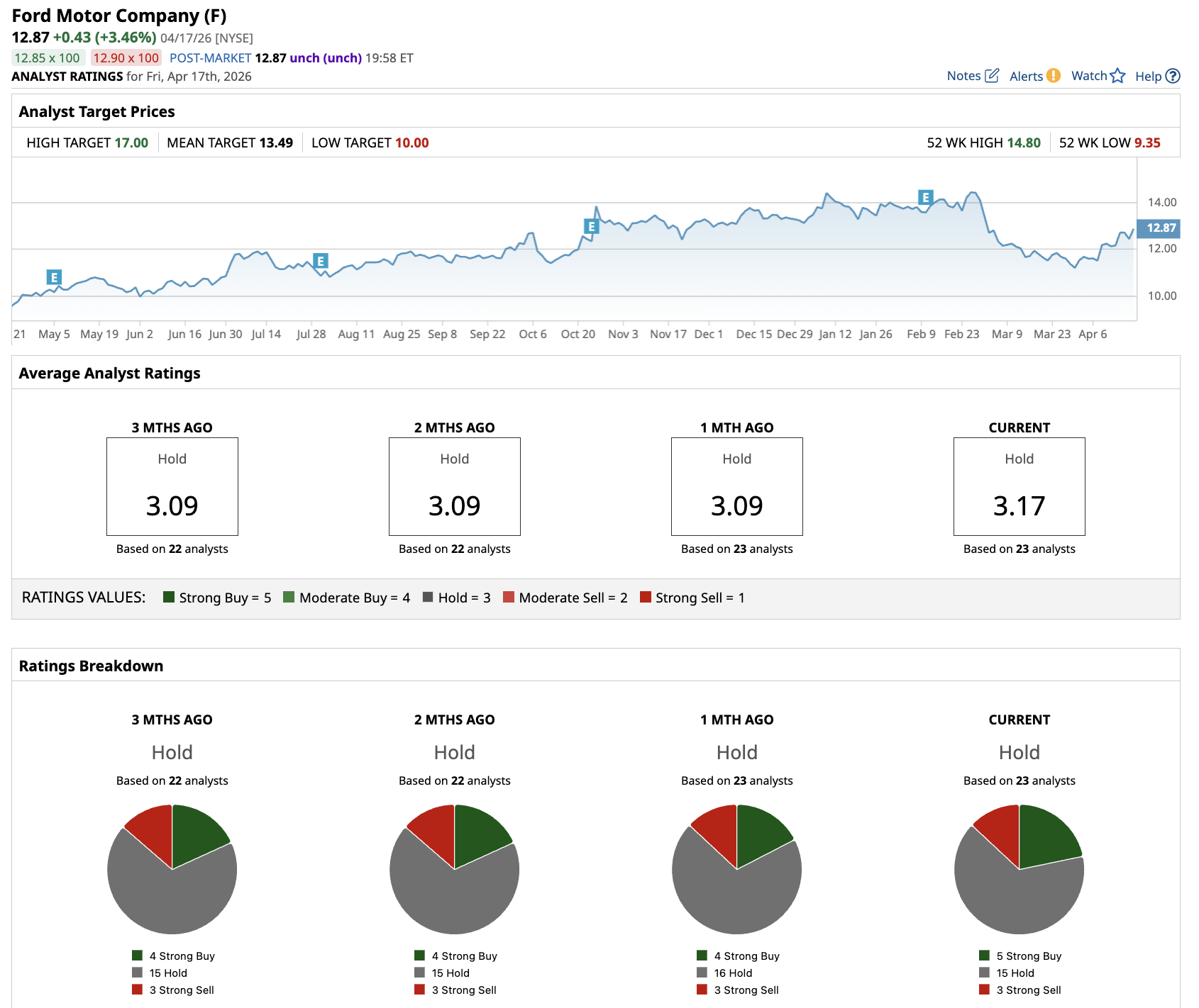 Out of the 23 analysts covering F stock, five recommend “Strong Buy,” 15 recommend “Hold,” and three recommend “Strong Sell.” The average Ford stock price target is $13.49, above the current price of $12.87.