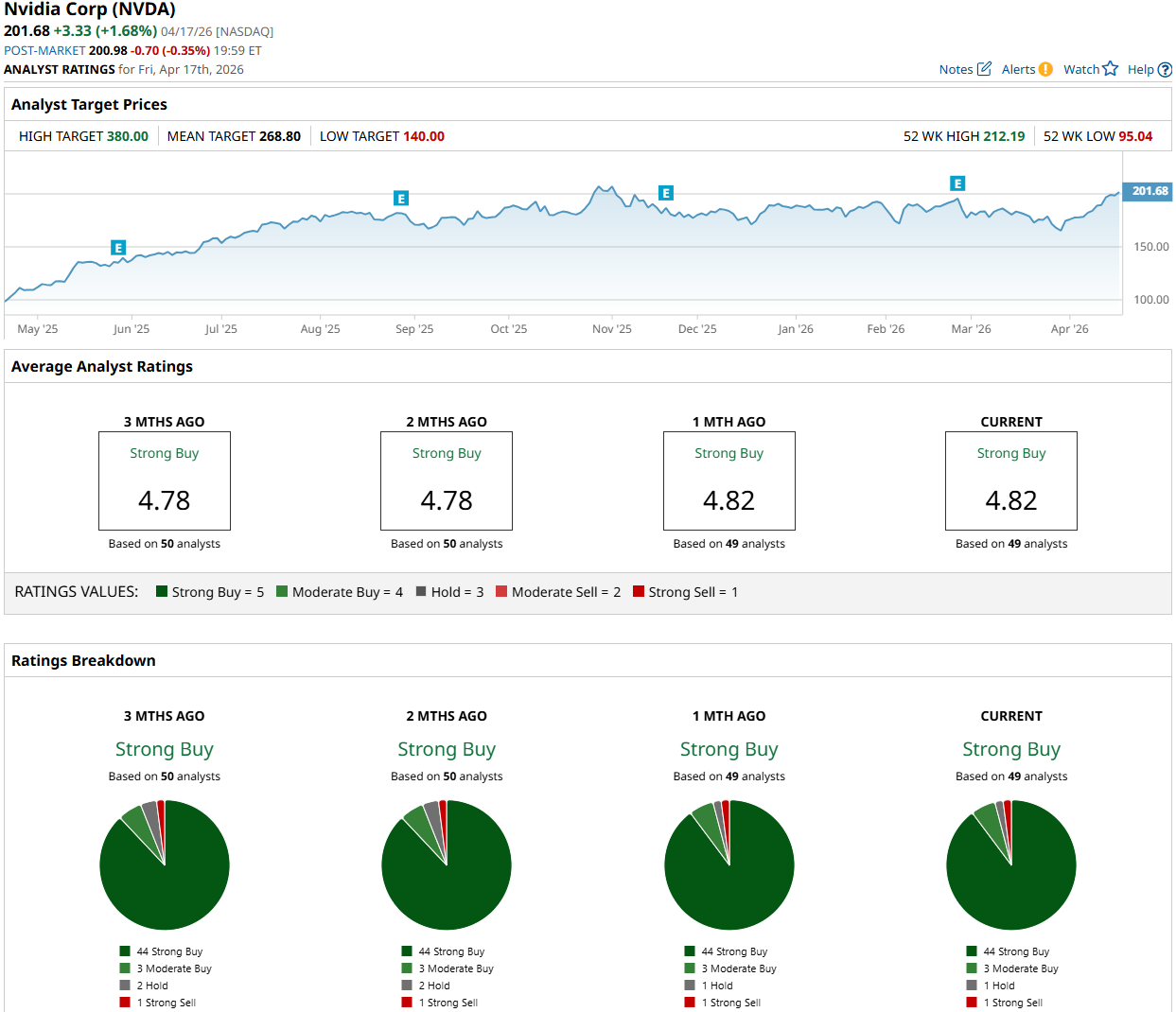 Nvidia’s stock has a top-tier “Strong Buy” consensus rating. Of the 49 analysts covering the stock, 44 rate it a “Strong Buy,” three assign a “Moderate Buy” rating, one suggests holding, and one gives it a “Strong Sell” rating. The mean price target for NVDA stock stands at $268.80, indicating a potential upside of 33.3% from Friday’s closing price.