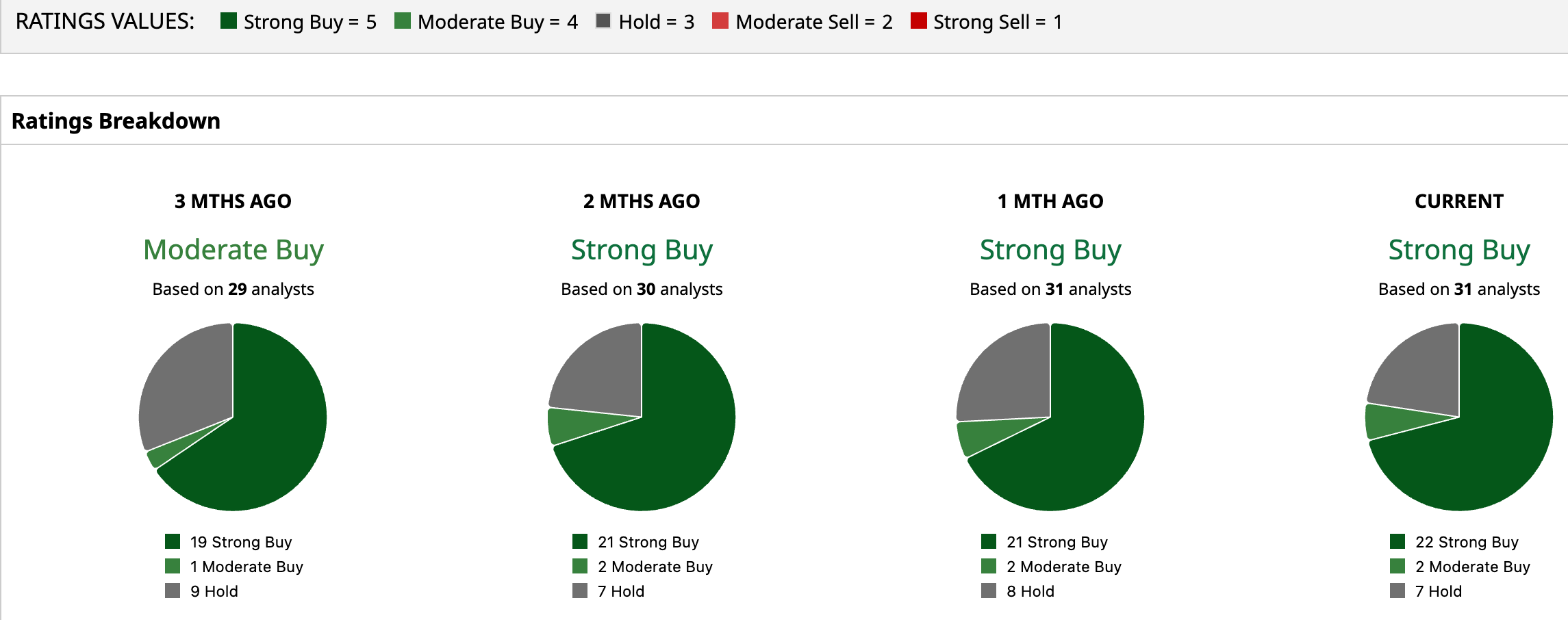 Wall Street has backed the stock with an overall rating of “Strong Buy.” Among 31 analysts covering the stock, 22 have issued “Strong Buy” ratings, two have gone with “Moderate Buy,” and seven have stayed with “Hold” calls.