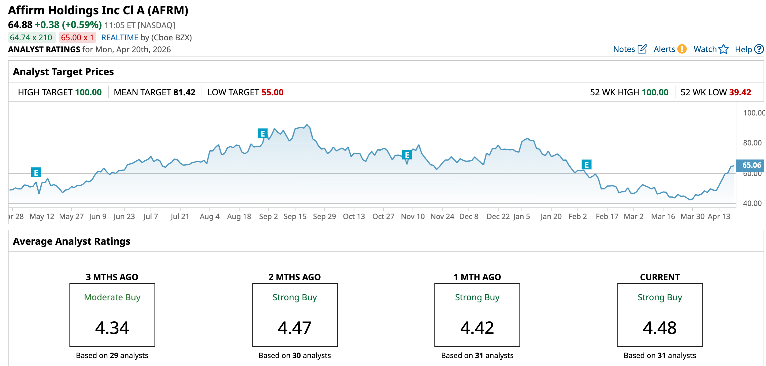 AFRM stock carries an average price target of $81.42, which signals potential upside of 25.5%. Meanwhile, the Street-High target of $100 points to a gain of 54% from current levels.