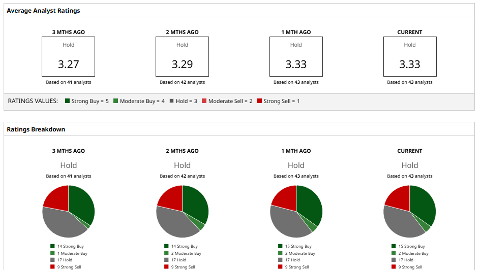 Analysts remain divided on TSLA stock. The consensus rating is a “Hold,” with the average 12-month target at $400.58. That suggests minimal potential upside, with the stock currently trading near $391.