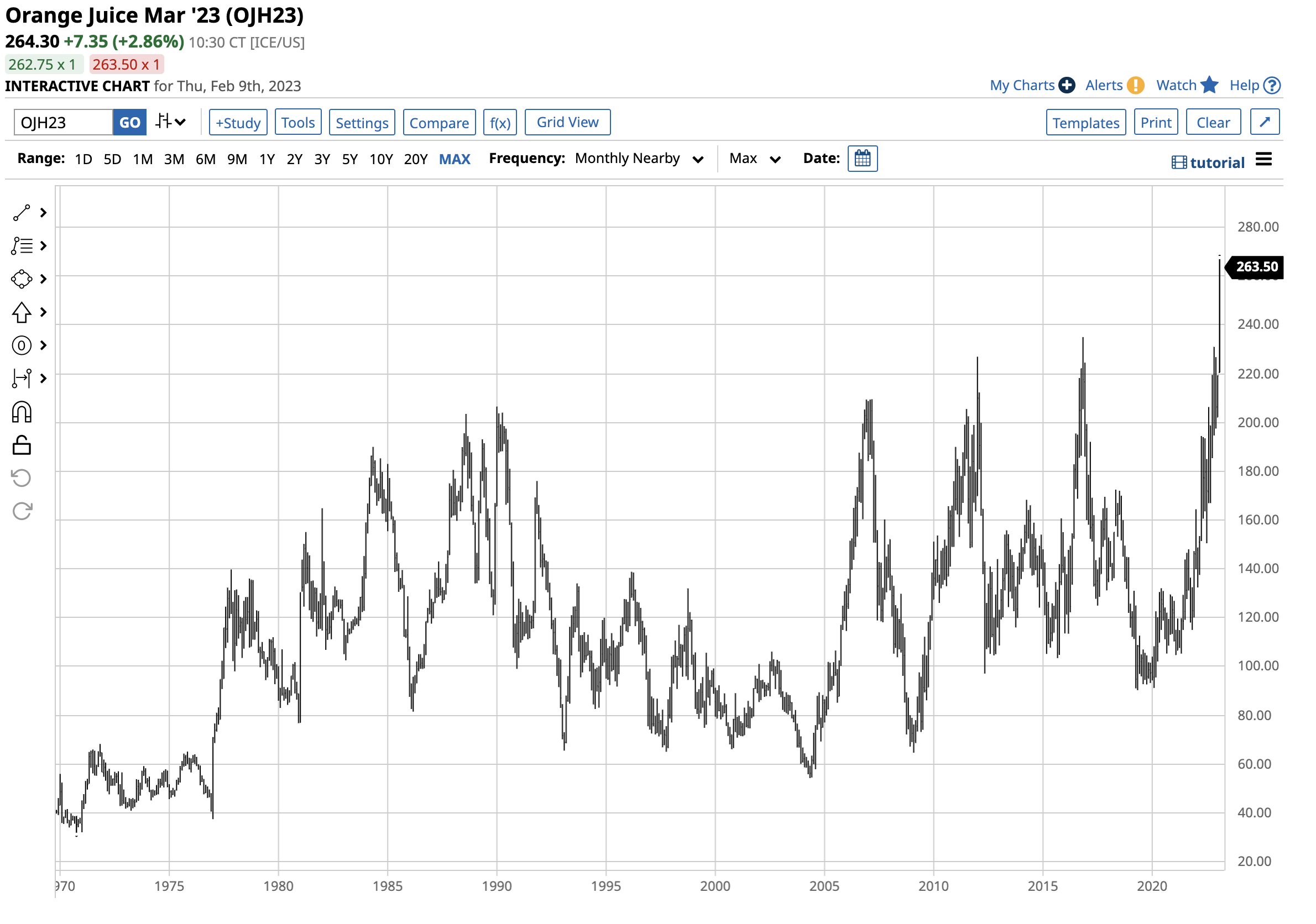 In February 2023, frozen concentrated orange juice futures on ICE reached a milestone as they rose to a new record high.