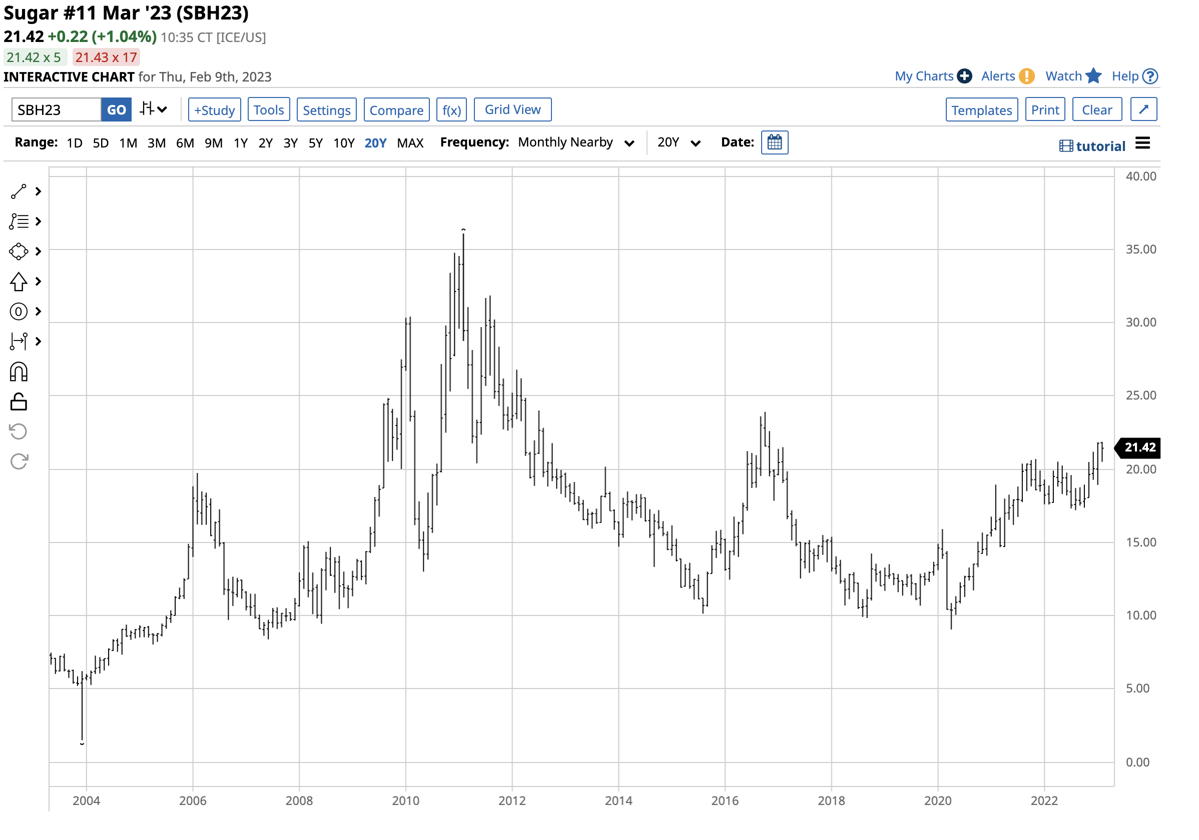The chart illustrates the rise in world sugar prices that reached 21.86 cents per pound in February 2023, the highest price since November 2016. World sugar futures were trading over 201.40 cents per pound on February 9, 2023.