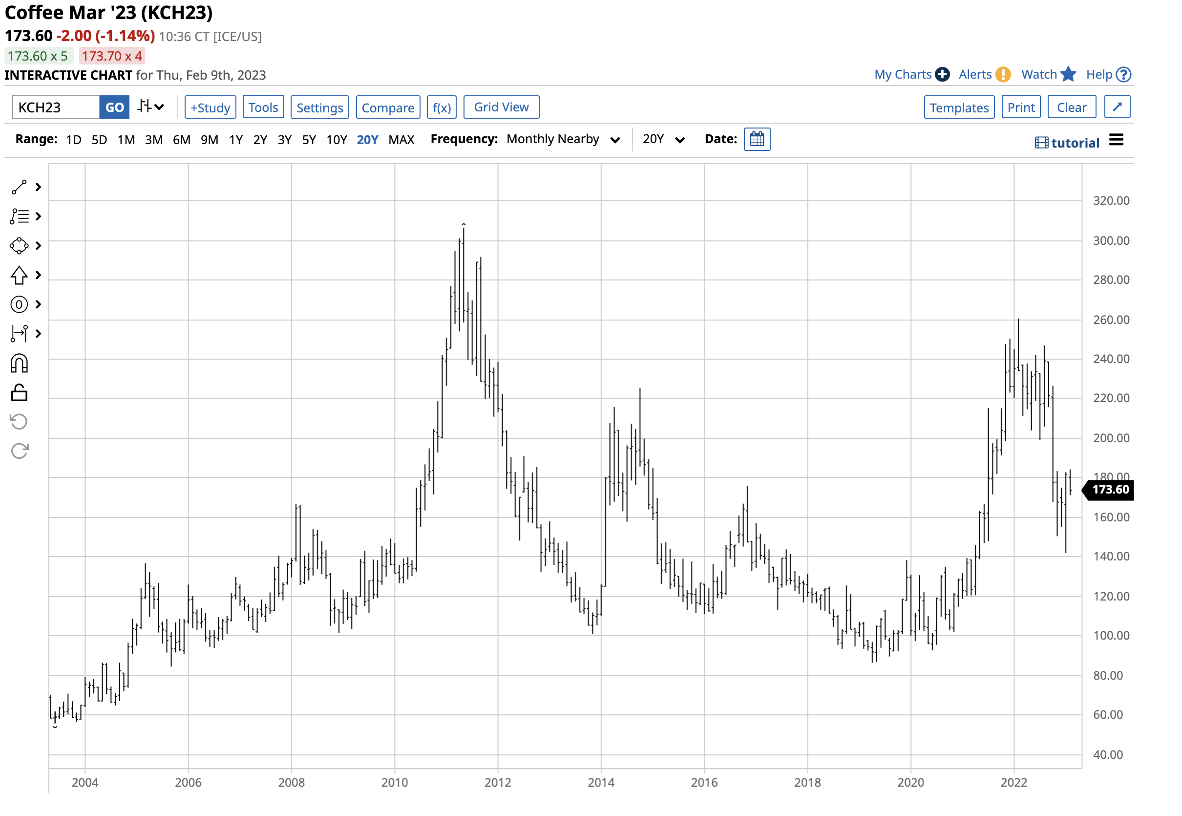 The chart illustrates Arabica coffee bean futures rose to $2.6045 per pound in February 2022, the highest level since 2011. After correcting to $1.4205 per pound in January 2023, coffee futures were back above the $1.73 level on February 9.