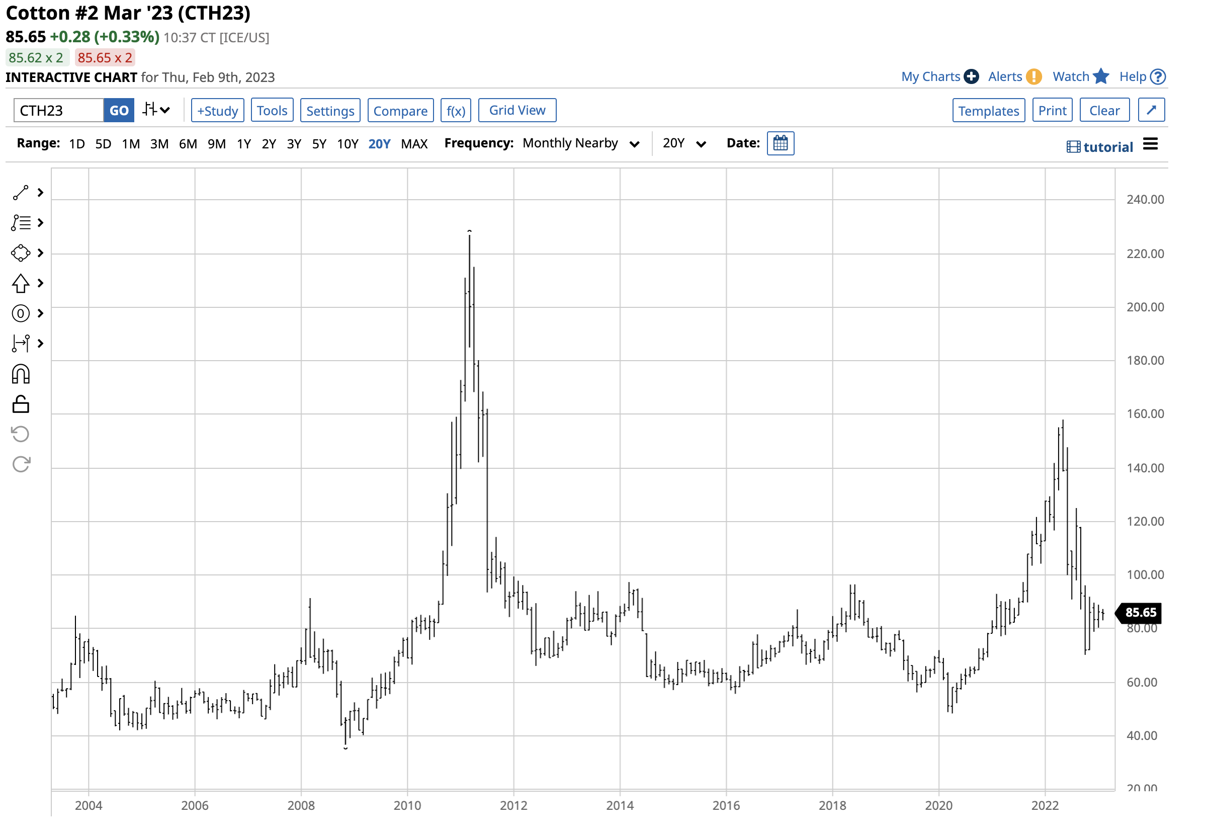 The chart of ICE cotton futures shows a rise to $1.5802 in May 2022. After falling to a 70.21 cents per pound low in October 2022, the cotton market recovered to 85.65 cents on February 9.