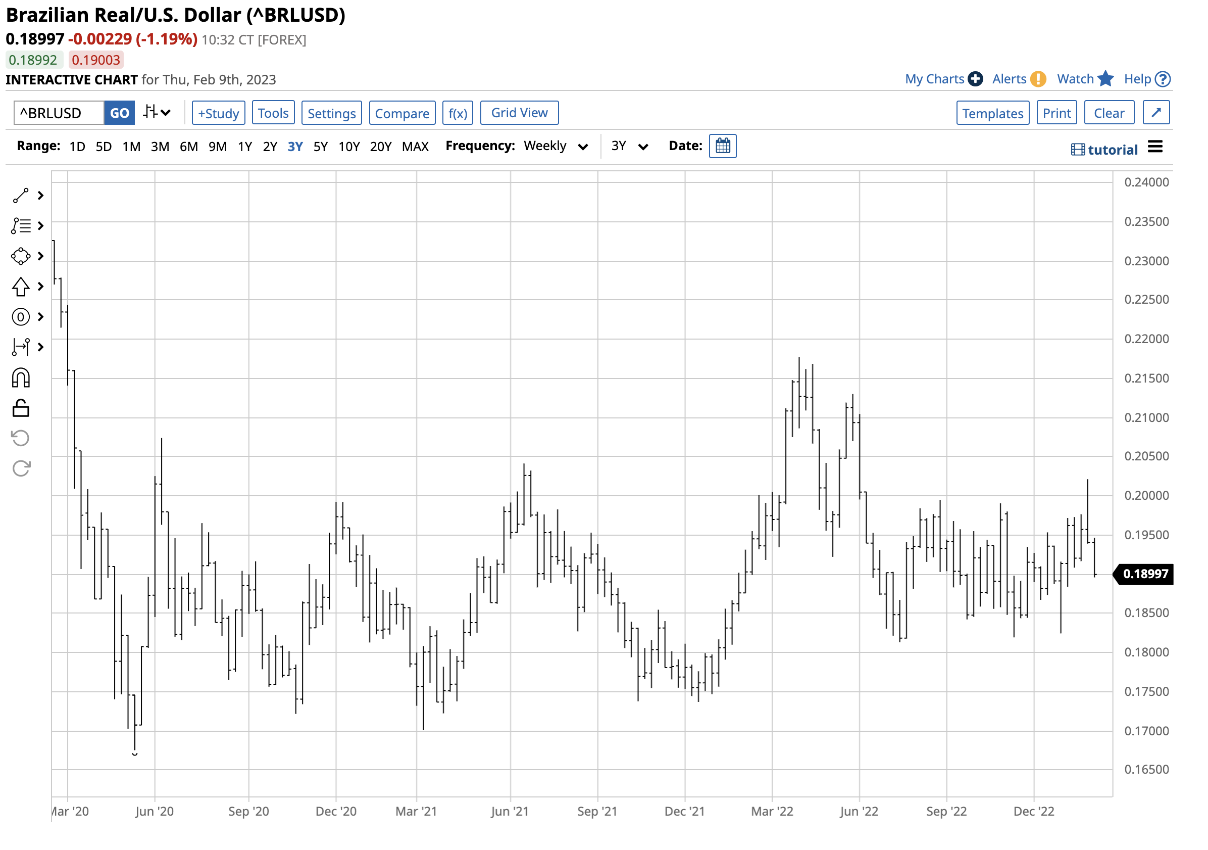 The currency relationship between the Brazilian real and the U.S. dollar is critical for soft commodity prices. In a December 29, 2022, Barchart article, I wrote, “Many issues face the Brazilian currency in the coming year. President Lula’s Democratic-Socialist ideology will impact the economy, but the government and populace remain divided as the election was close. However, rising worker wages could put upward pressure on commodity production costs. Moreover, the U.S. dollar has been trending lower since reaching a two-decade high in 2022. The fall in the dollar supports higher soft commodity prices. The highest inflation in decades continues to erode fiat currency values, leading to higher raw material prices.” On December 29, the U.S. dollar versus the real exchange range stood at $0.19077. On February 9, it had edged lower to just below $0.19000.