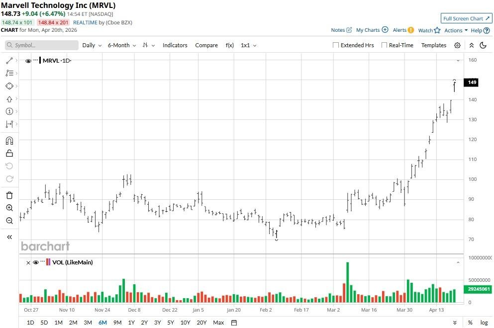 Marvell Technology (MRVL) shares are trading at a record high on Monday following reports that Alphabet's (GOOG) (GOOGL) Google is in talks with it to co-develop two of its new artificial intelligence (AI) centric processors.