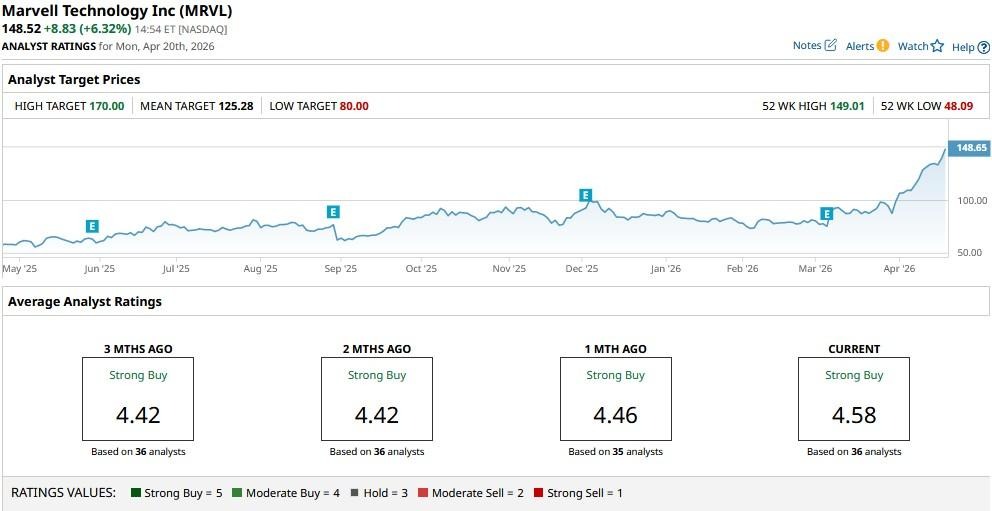 The consensus rating on MRVL shares sits at “Strong Buy” currently, with price objectives as high as $170, indicating potential upside of another 14% from here.