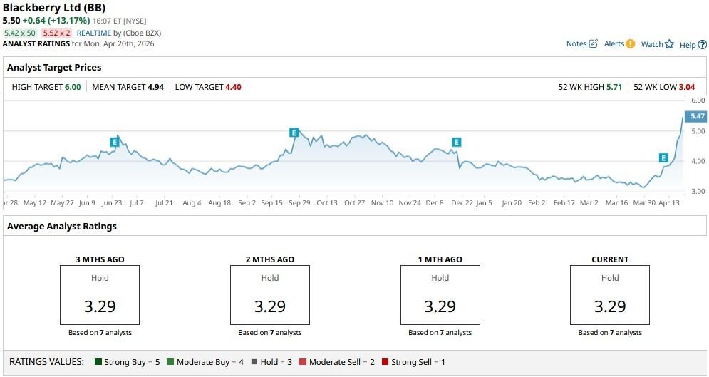 The consensus rating on BB stock sits at a “Hold," with the mean price target of $4.94 indicating potential downside of about 10% from here.