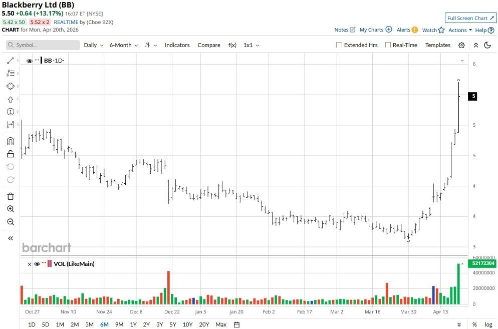 BlackBerry (BB) shares ripped higher on April 20 after the embedded software firm announced an expanded partnership with the artificial intelligence (AI) sector leader Nvidia (NVDA).
