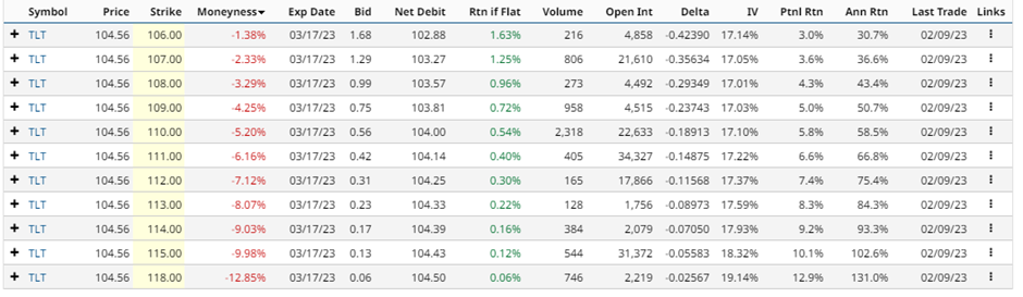 Instead of the March 106 call, let’s look at the 111 call. Selling the March 111 call option for $0.42 generates an income of 0.40%, in 35 days, equalling around 4.09% annualized. If TLT closes above 111 on the expiration date, the shares will be called away at 111, leaving the trader with a total profit of $686 (gain on the shares plus the $42 option premium received).