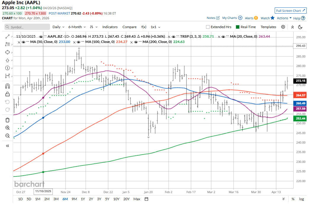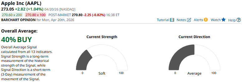 Apple will next report earnings on April 30, with analysts calling for $1.91 in earnings per share, an increase of 15.76% year over year. As of this writing, Barchart’s proprietary Opinion technical analysis system gives AAPL a 40% “Buy” rating.