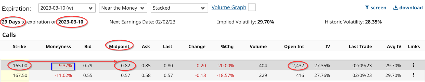 For example, the Barchart March 10, 2023, expiration option chain below shows that the $165.00 strike price calls trade for 82 cents. This strike price has the largest number of contracts outstanding for OTM calls in the March 10 expiration chain. It is also 10% above today's price.