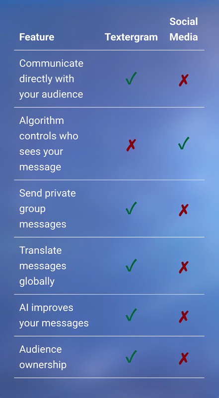 The company also provides comparison tools through its website that outline differences between Textergram and other messaging or social platforms. These comparisons emphasize transparency, control, and reliability as key distinctions in its offering.