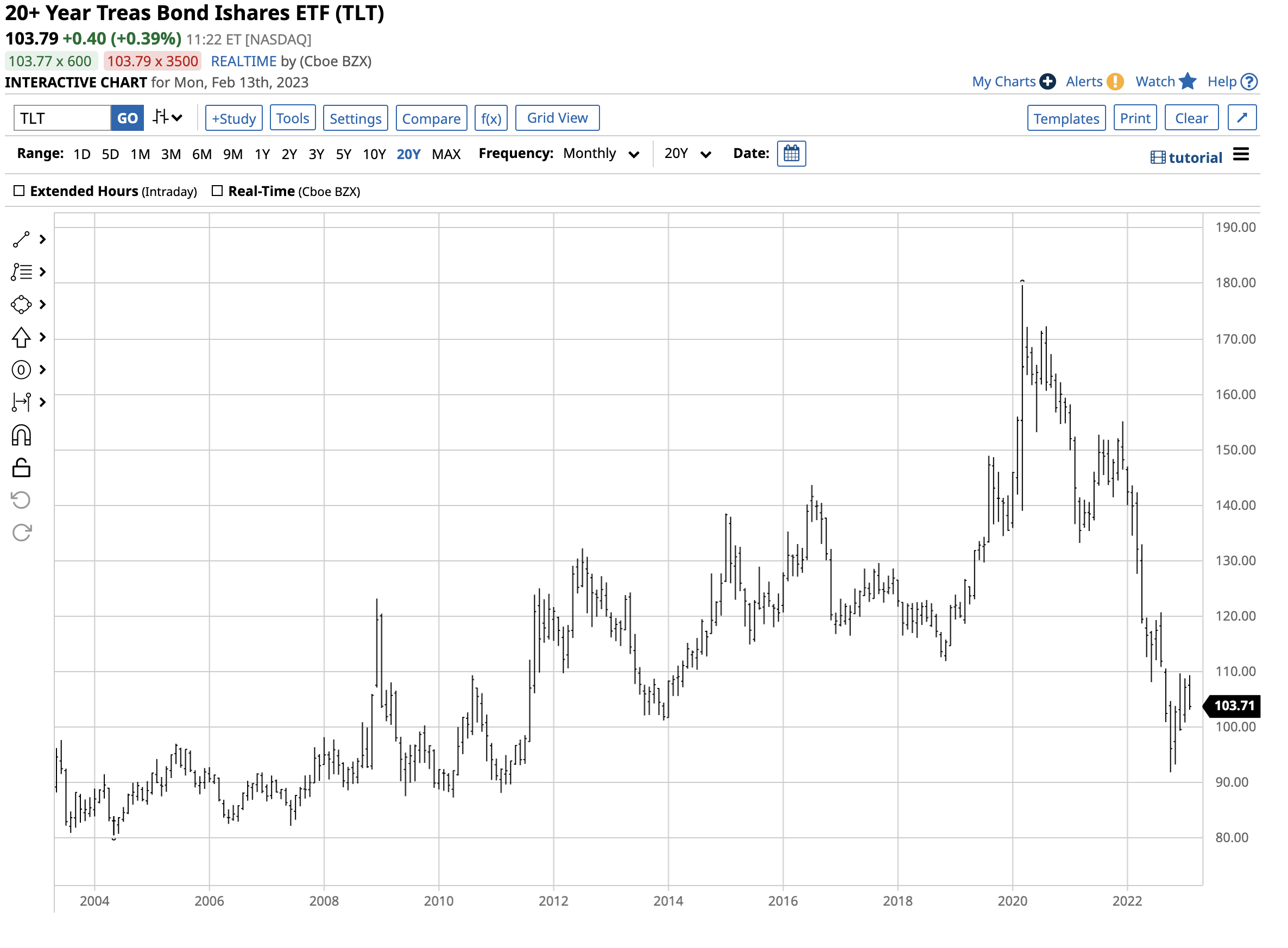 The chart shows the highly liquid iShares 20+ Year Treasury Bond ETF product (TLT) displays the same bearish pattern as the long bond futures.