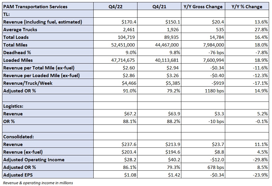 Truckload carrier P.A.M. Transportation Services didn’t provide an outlook for 2023 in its fourth-quarter report issued Monday after the market closed.