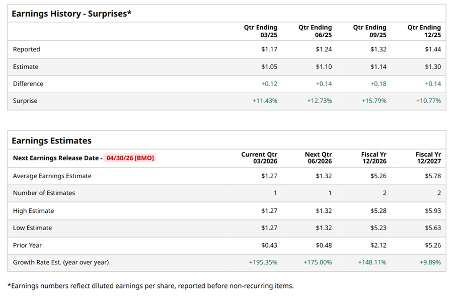 Portsmouth, New Hampshire-based Iron Mountain Incorporated (IRM) provides records management, data management solutions, and information destruction services. Valued at $35.9 billion by market cap, the company serves banking, energy, entertainment, health care, insurance, law firm, life science, retail, and pharmaceutical industries. The global leader in information management services is expected to announce its fiscal first-quarter earnings for 2026 before the market opens on Thursday, Apr. 30.