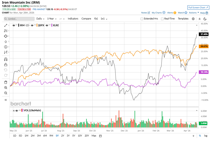 IRM stock has outperformed the S&P 500 Index’s ($SPX) 34.6% gains over the past 52 weeks, with shares up 43.1% during this period. Similarly, it outperformed the State Street Real Estate Select Sector SPDR ETF’s (XLRE) 10.4% gains over the same time frame.