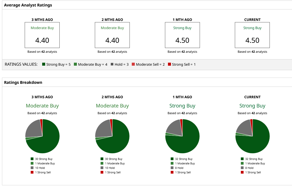 Analysts have been cautious on Oracle’s prospects during the last one month, with no upward price target revisions during the period. Still, a vast majority of the 42 analysts covering ORCL stock assign a “Strong Buy” rating. The mean target price of $253.21 suggests further upside of 43% from here, which shows how far the stock has fallen over the last six months. At one point in 2025, ORCL stock traded at roughly double the price that it now trades at today.