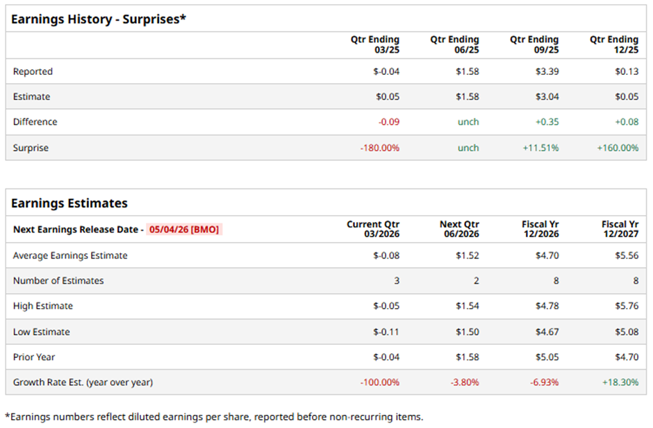The Phoenix, Arizona-based company is expected to unveil its fiscal Q1 2026 results before the market opens on Monday, May 4. Ahead of the event, analysts anticipate PNW to report a loss of $0.08 per share, a decrease of 100% from a loss of $0.04 per share in the year-ago quarter. It has exceeded or met Wall Street's bottom-line estimates in three of the past four quarters while missing on another occasion.