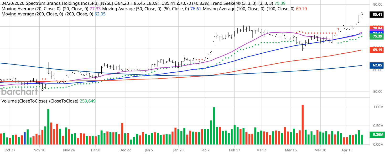 I found today’s Chart of the Day by using Barchart’s powerful screening functions to sort for stocks with the highest technical buy signals; superior current momentum in both strength and direction; and a Trend Seeker “buy” signal. I then used Barchart’s Flipcharts feature to review the charts for consistent price appreciation. SPB checks those boxes. The Trend Seeker issued a new “Buy” signal on April 9. Since then, the stock has gained 6.47%.