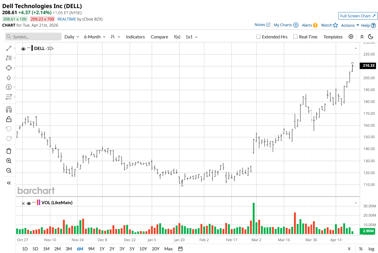 On April 16, JP Morgan analyst Samik Chatterjee increased the firm’s price target on the stock from $165 to $205 while keeping an “Overweight” rating. A day earlier, Goldman Sachs also raised its price target on DELL from $195 to $215 and kept a “Buy” rating. Bullish analyst sentiment further reinforces the company’s growth outlook.