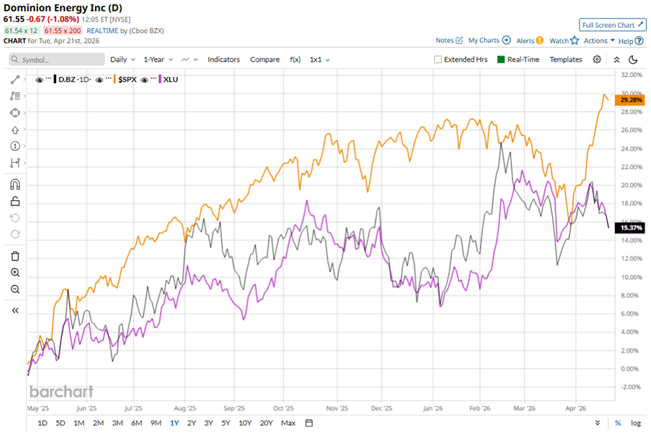 Dominion Energy stock has returned 17.7% over the past 52 weeks, underperforming both the S&P 500 Index's ($SPX) 37.5% gain and the State Street Utilities Select Sector SPDR ETF's (XLU) 18.7% increase over the same period.