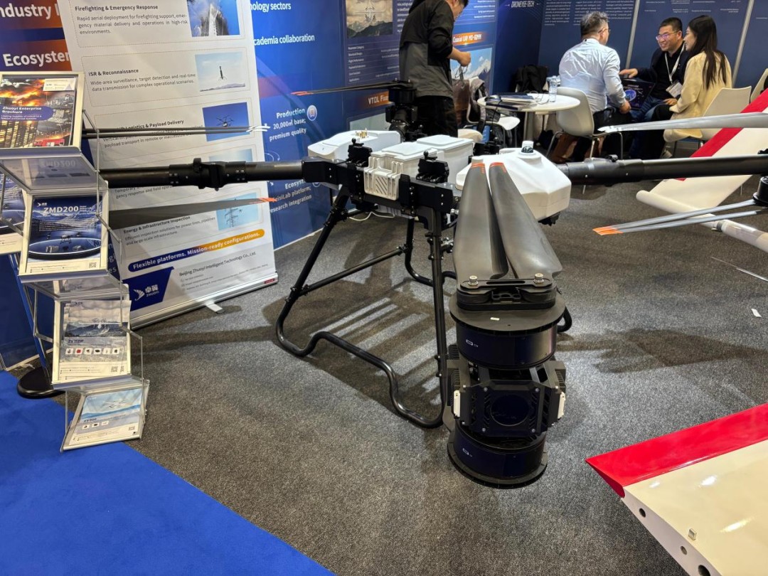 The hybrid-wing UAVs exhibited by Droneyee Tech, the ZV30E and ZV150P, integrate cutting-edge technology with a concept of omnidirectional adaptability concept. Both can be deployed in complex terrains with confined spaces. Their dual-pitot-tube redundant architecture ensures stable operation under extreme conditions. They are integrated with a GNSS-denied visual positioning redundancy solution, coupled with special flight certification and modular payloads, achieving multi-role capability and omnidirectional adaptability, demonstrating advanced technological barriers.