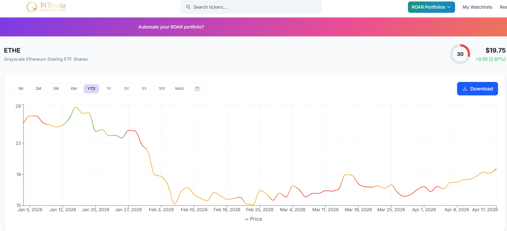 I am encouraged by ETHE’s ROAR Score for two reasons. First, the score was at 30 as of Friday’s close, but looked poised to rise from there. Even a move to 40 or 50 would likely indicate that there’s more gas in the tank here.