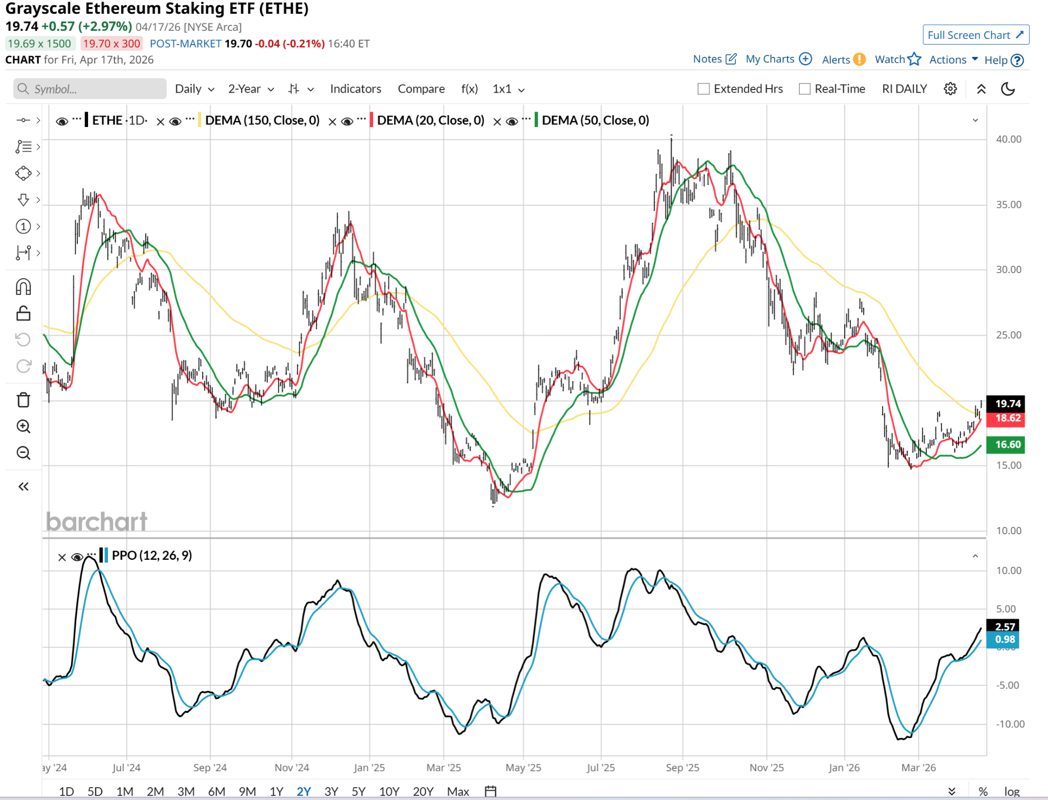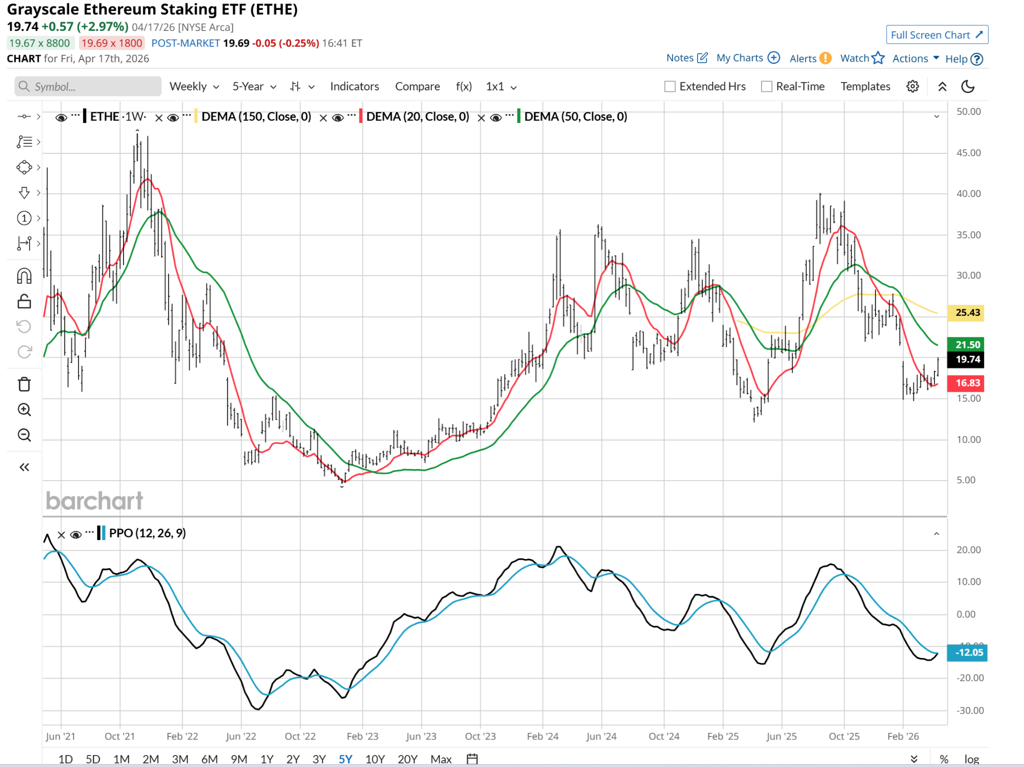 But in the wake of the Iran war, crypto technical charts, while not my favorite investing subject, are starting to show what I call “signs of intelligent life.” Here are the charts and the associated real-world case for a temporary rally in ETHE.