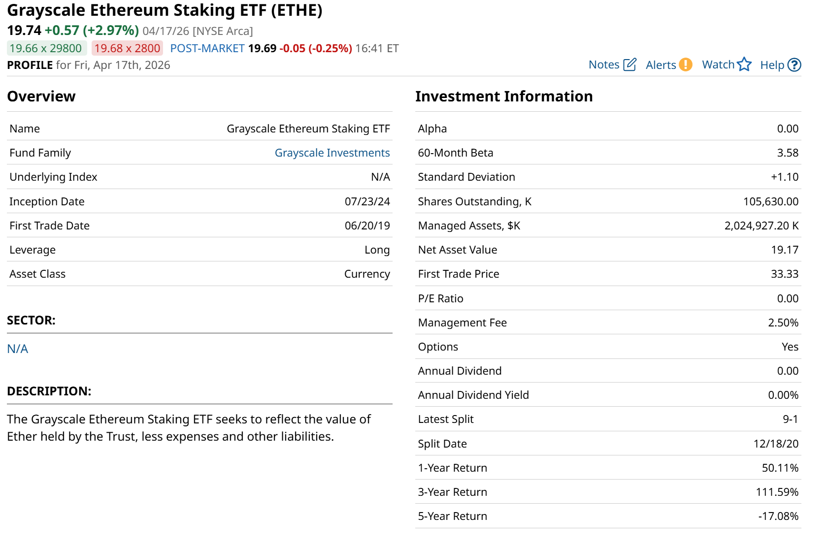And since it has yet to prove itself as more than a high-beta play on the broad stock market, specifically the technology sector, the risk remains in the form of a broader risk-off environment in the equity markets. That could drag ETHE down, regardless of its fundamentals.