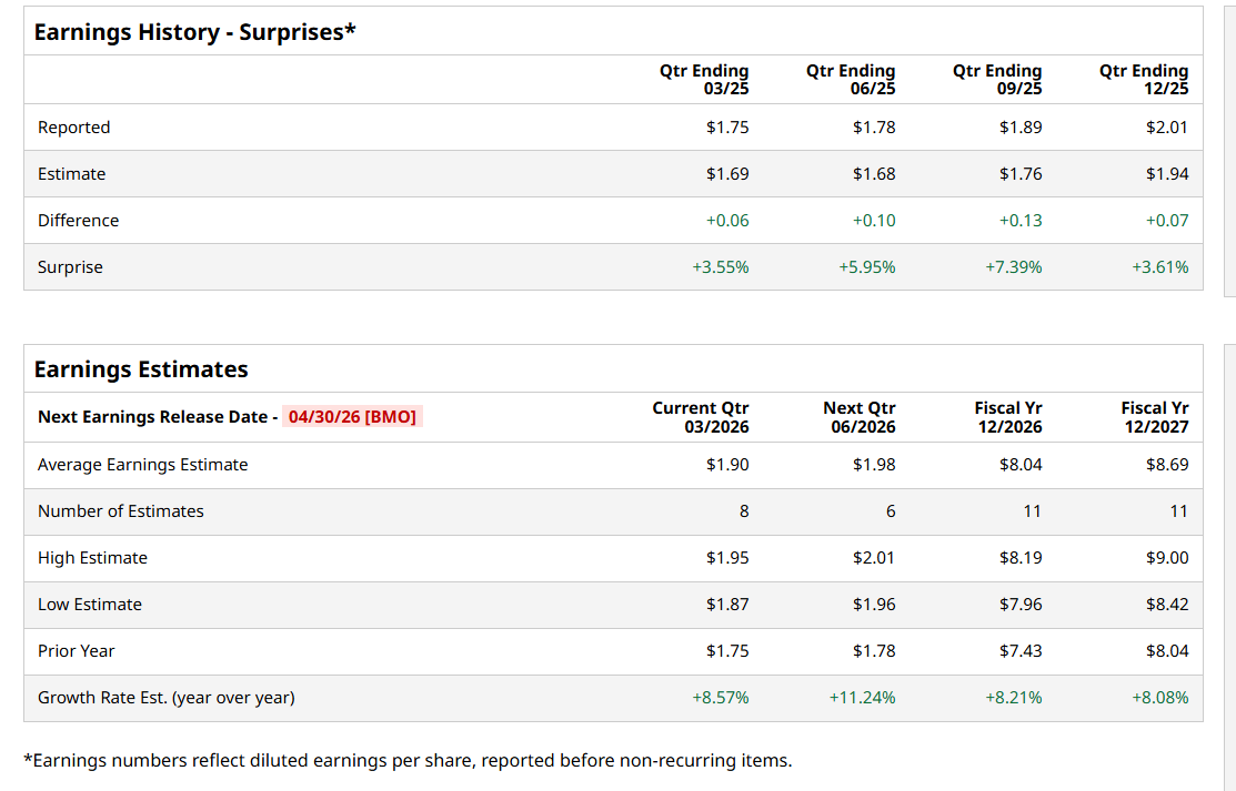 Ahead of this event, analysts expect this industrial company to report a profit of $1.90 per share, up 8.6% from $1.75 per share in the year-ago quarter. The company has topped Wall Street’s bottom-line estimates in each of the last four quarters. In Q4 2025, AME’s EPS of $2.01 outpaced the consensus expectations by 3.6%.