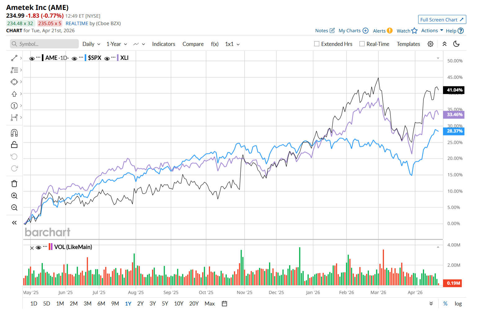 AME has soared 51.2% over the past 52 weeks, considerably outpacing both the S&P 500 Index's ($SPX) 34.6% return and the State Street Industrial Select Sector SPDR ETF’s (XLI) 40.2% uptick over the same time period.