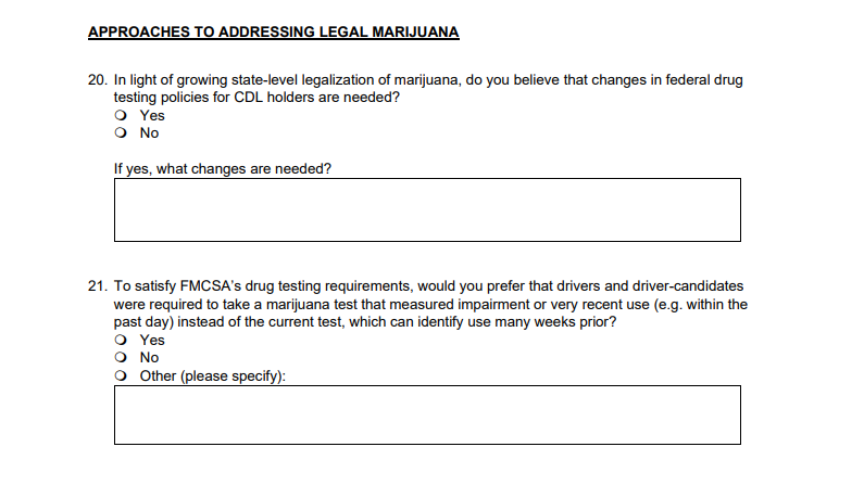 “What are we expecting to uncover in the new survey — well that’s exactly what we want to hear from motor carriers. There are a lot of statistics out there, but really we need to hear from a broad group of motor carriers on what’s going on in states where it is legal and what’s going on in states where it is illegal.”