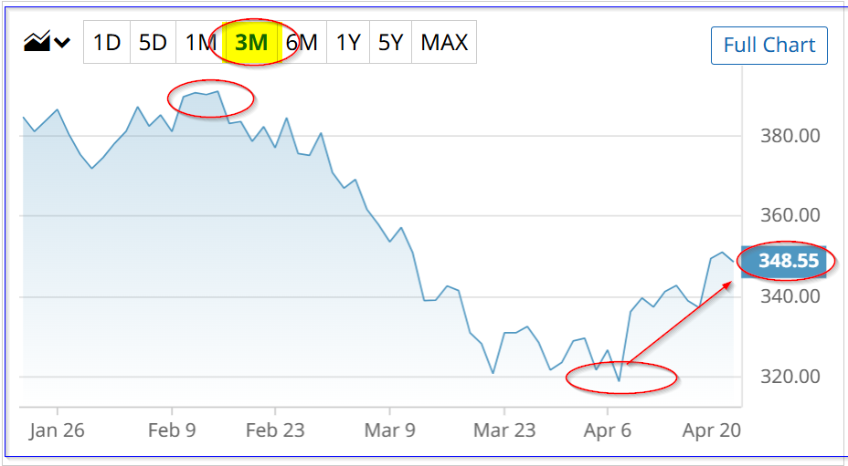 HD stock is lower in early trading at $347.97, but it's still up from a recent trough of $318.77 on April 7. However, it's still down significantly from a 3-month peak of $391.05 on Feb. 13.