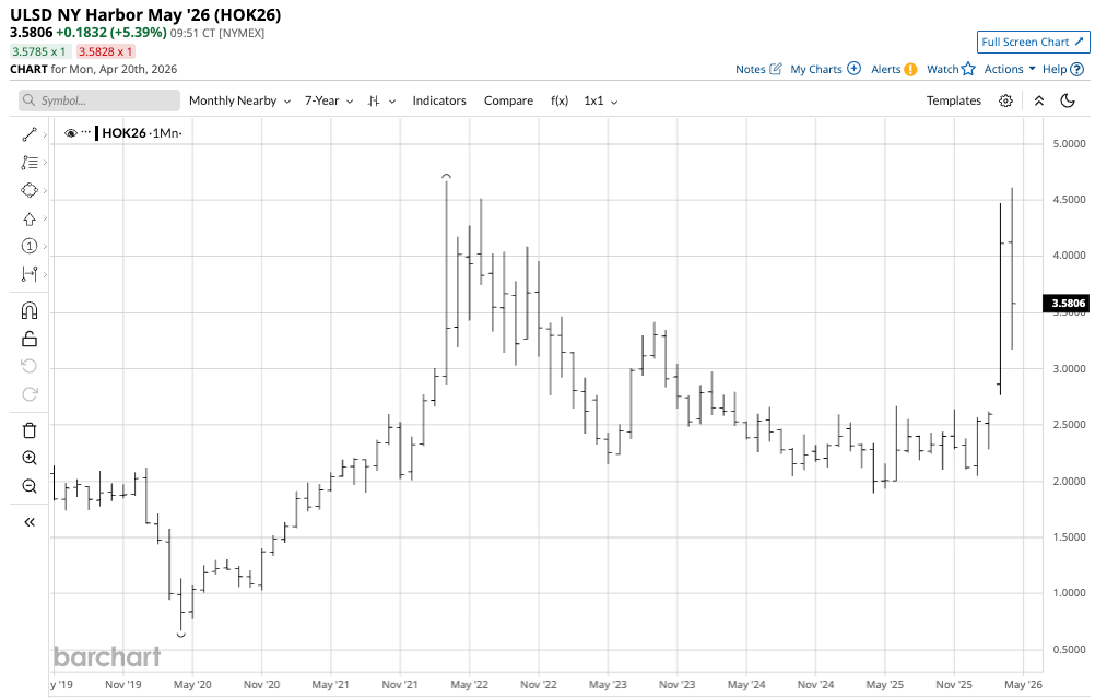 NYMEX heating oil futures rose 102.2% from a low of $2.2810 in February 2026 to a high of $4.6130 per gallon wholesale in April 2026.