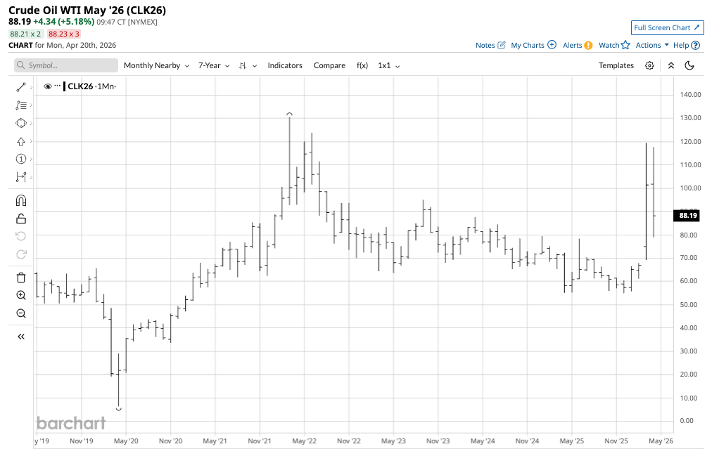The monthly continuous seven-year NYMEX WTI crude oil chart highlights the explosive move in March 2026.