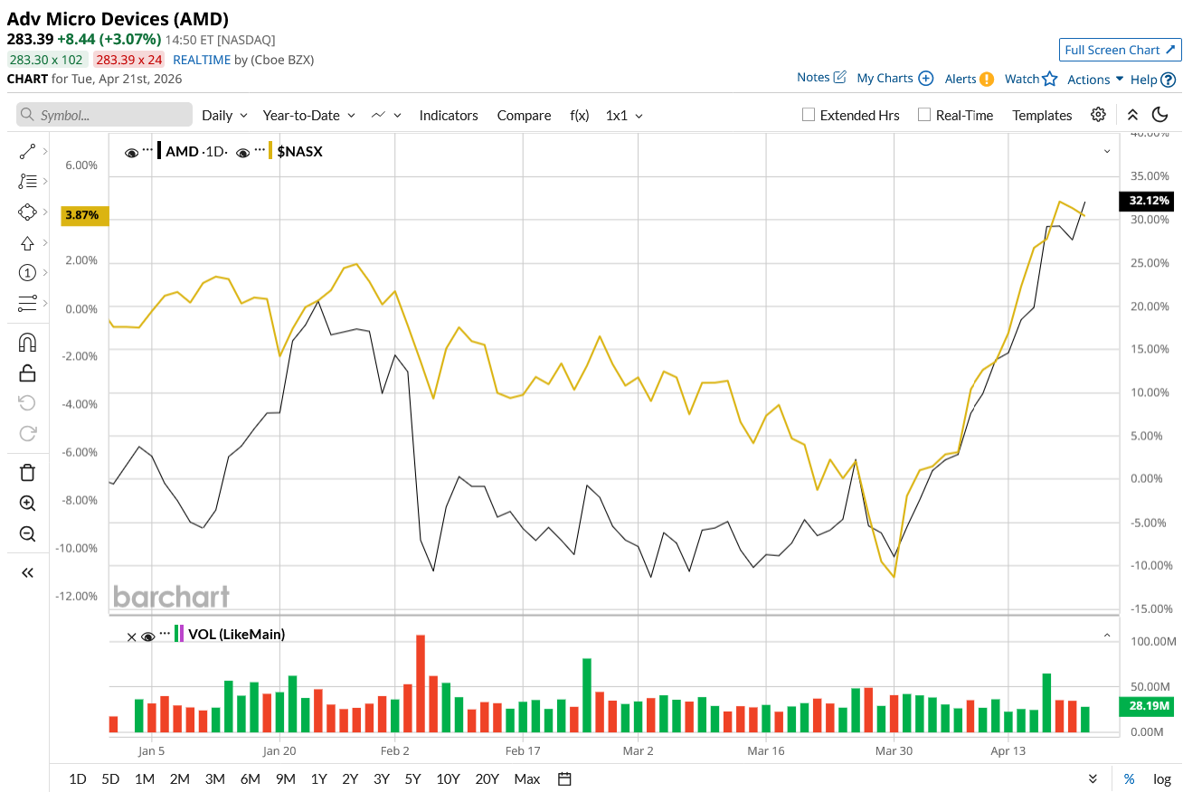 Valued at $448.2 billion, AMD stock is up 33% year-to-date (YTD), compared to the tech-led Nasdaq Composite Index ($NASX) gain of 4.7% YTD.