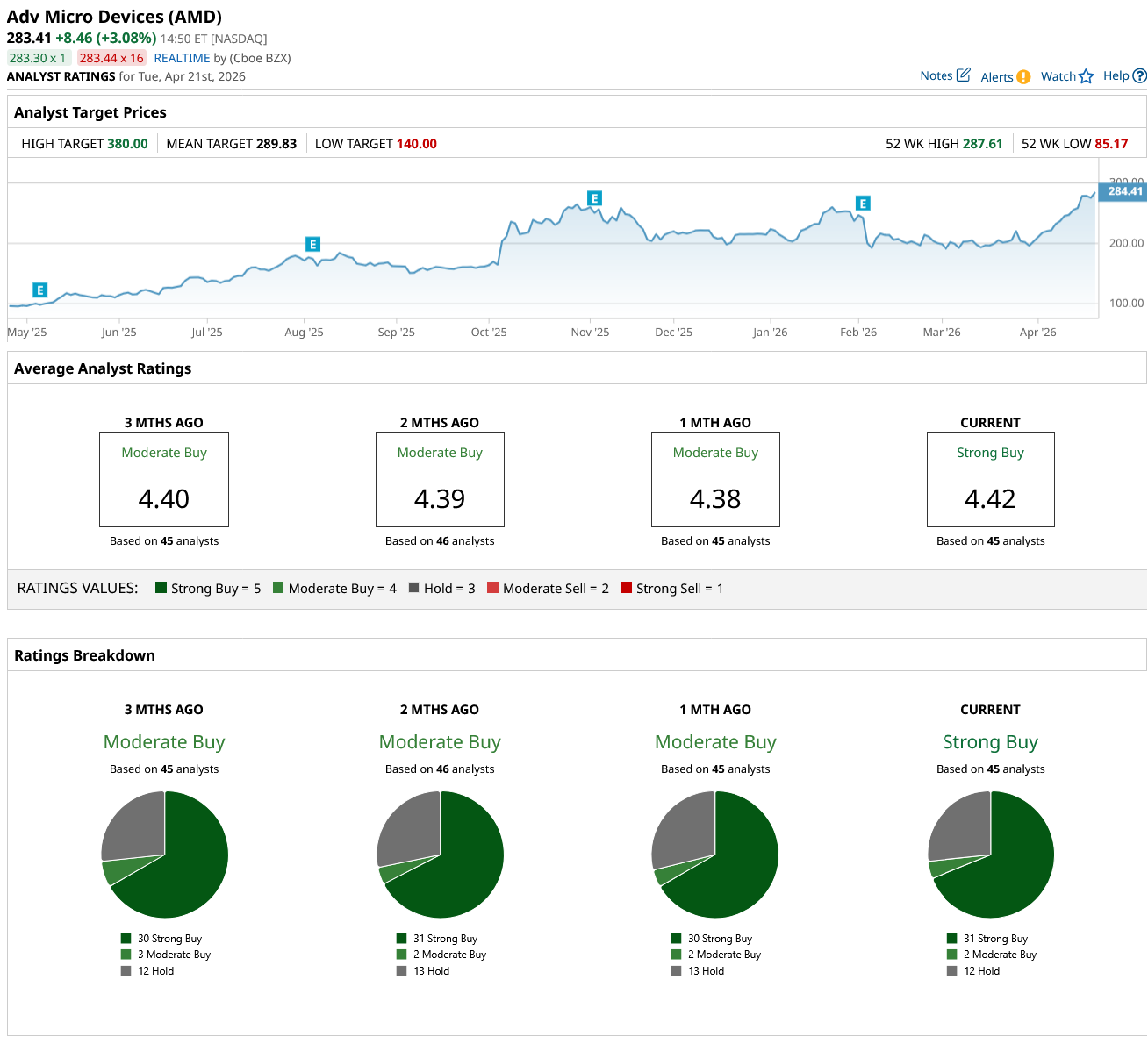 Overall, Wall Street says AMD stock is a “Strong Buy.” Of the 45 analysts covering the stock, 31 rate it a “Strong Buy,” two rate it as a “Moderate Buy,” and 12 rate it a “Hold.” The stock has an average target price of $288.83, which it is just shy of. Plus, the high price estimate of $380 suggests the stock has an upside potential of 34% over the next 12 months.